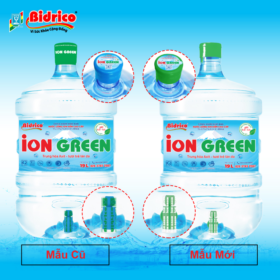 Lưu ý: Trong quá trình thay đổi, giai đoạn đầu trên thị trường sẽ tồn tại cả 02 mẫu bình ION GREEN 19 lít (mới và cũ) và có chất lượng như nhau. Đối với các sản phẩm theo mẫu cũ vẫn có giá trị lưu hành trên thị trường và hạn sử dụng theo đúng thời hạn sử dụng in trên sản phẩm.